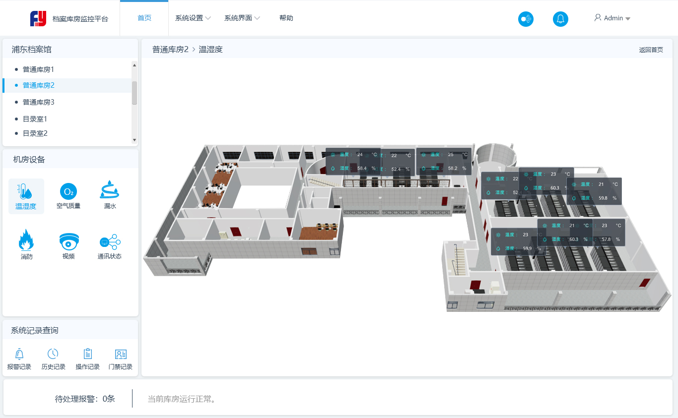监控平台针对档案/库房温湿度自动调控及空气质量监测、漏水监测等。系统实时采集各库房内的温度、湿度及空气质量等数据将数据上传到监控平台,对数据进行综合分析。并下